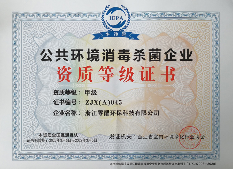 證書(shū)名稱:公共環(huán)境消毒殺菌企業(yè)資質(zhì)等級(jí)證書(shū)
